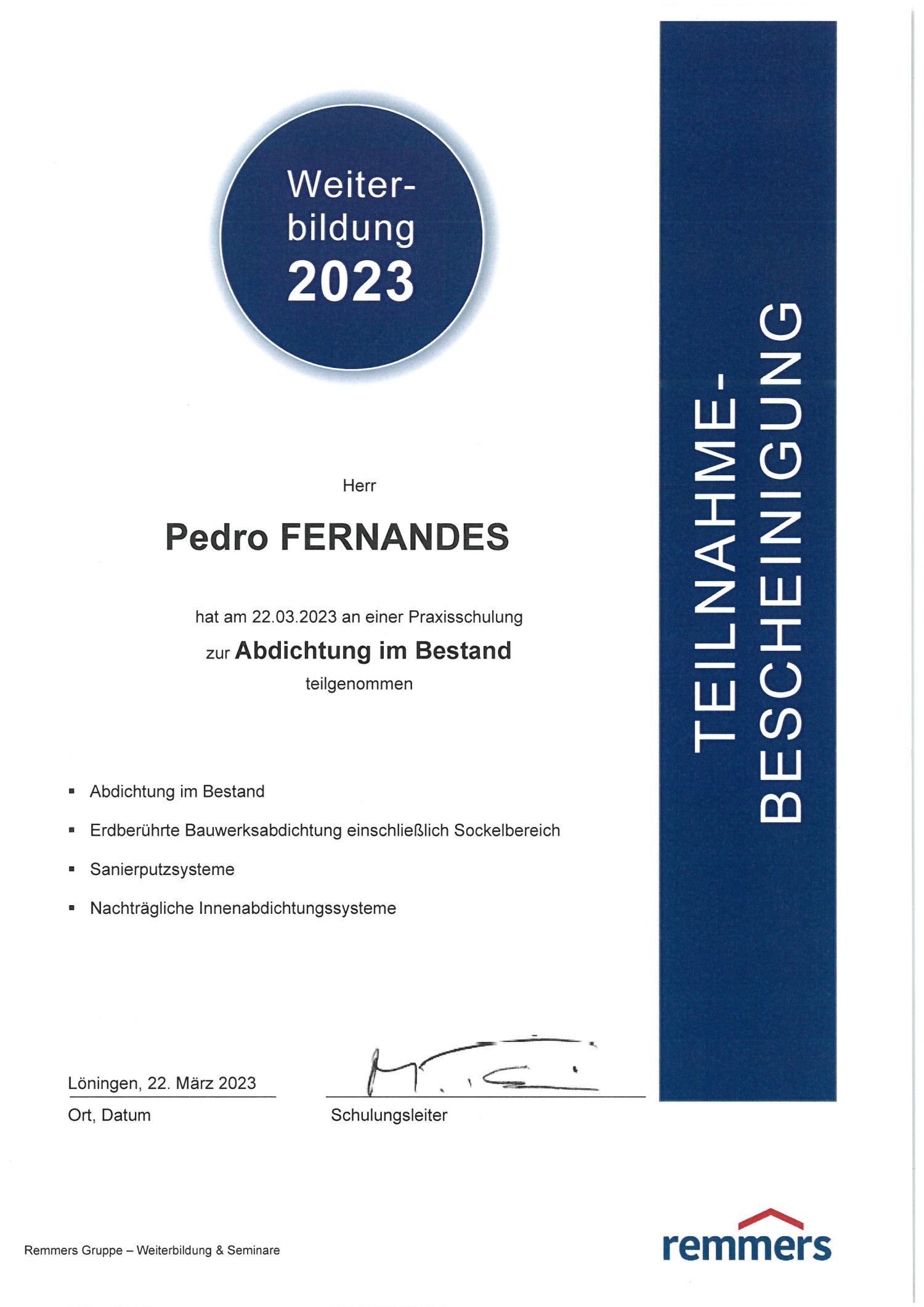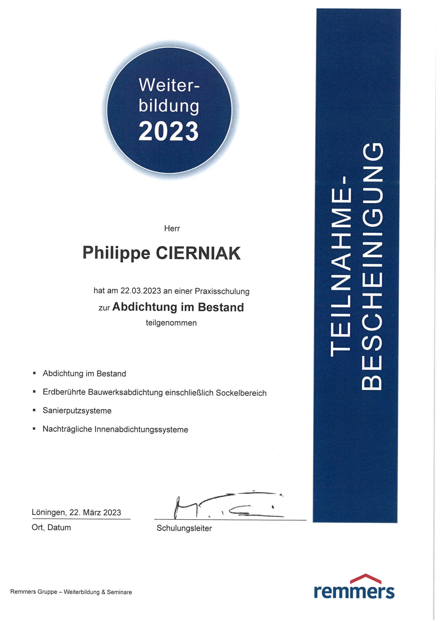 Dës Woch war et eng Formatioun zu Troisdorf (D) bei REMMERS, Spezialist fir d'Hierstellung vun bauchemischen Produiten. Haaptthema war d'Oofdichtung vun Baudeeler, wou REMMERS ganz speziell Léisungen fir Baussen-, wéi och Bannenoofdichtungen ubidden kann.