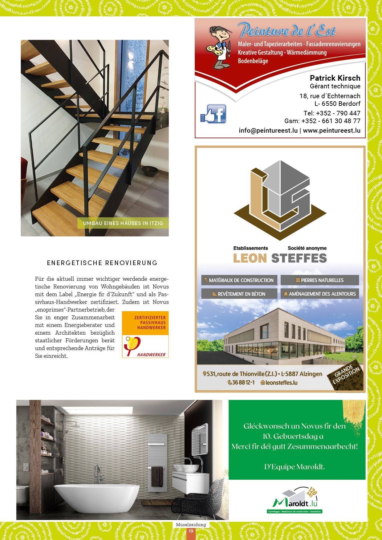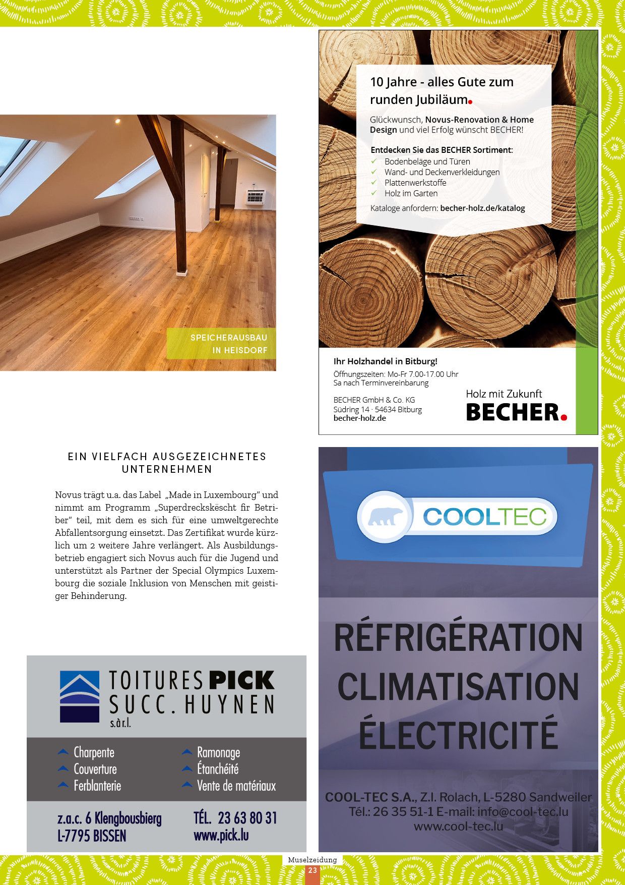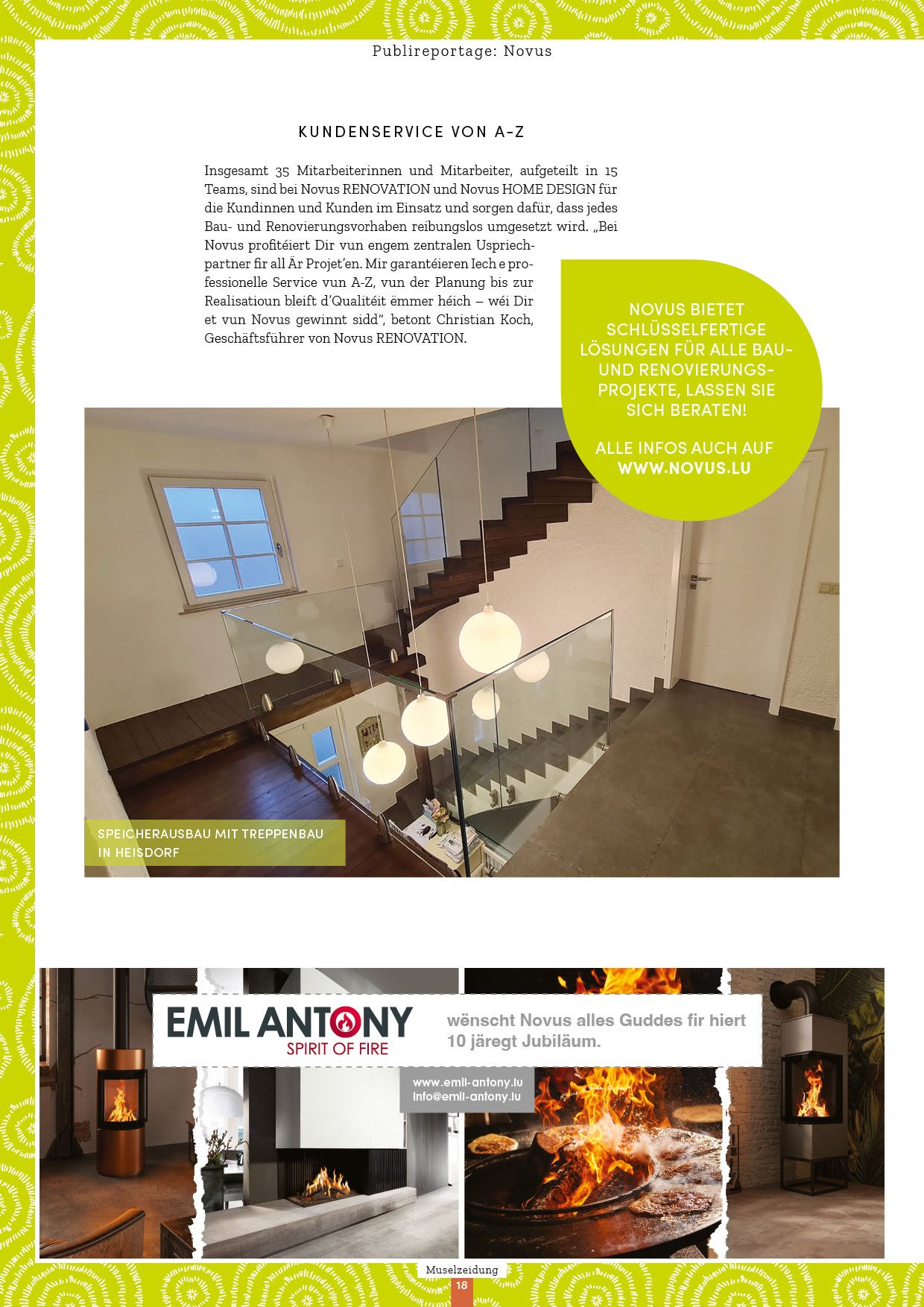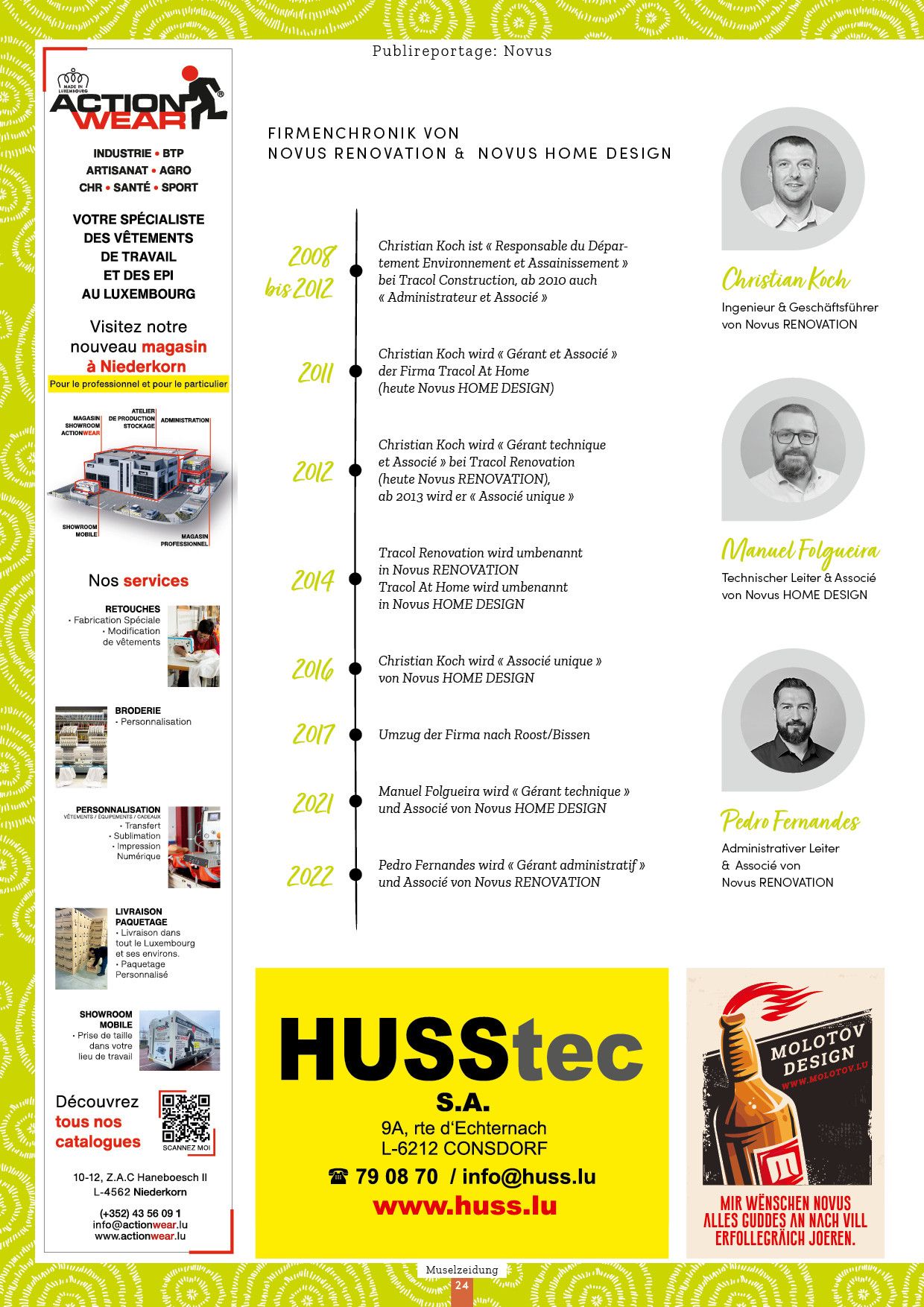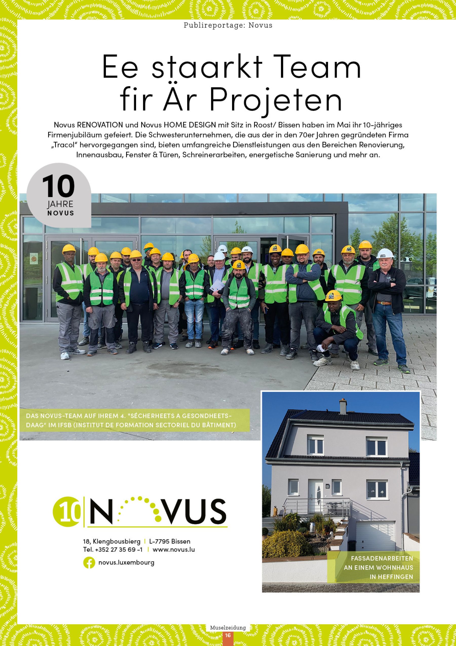 Novus RENOVATION et Novus HOME DESIGN, basés à Roost/Bissen, ont fêté leur 10e anniversaire en mai. Les sociétés sœurs, issues de la société "Tracol" fondée dans les années 1970, proposent des services complets dans les domaines de la rénovation, de l'aménagement intérieur, des portes et fenêtres, de la menuiserie, de l’assainissement énergétique et bien plus encore.